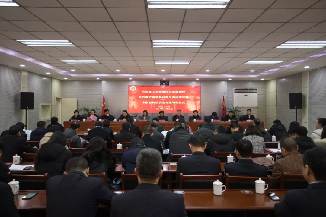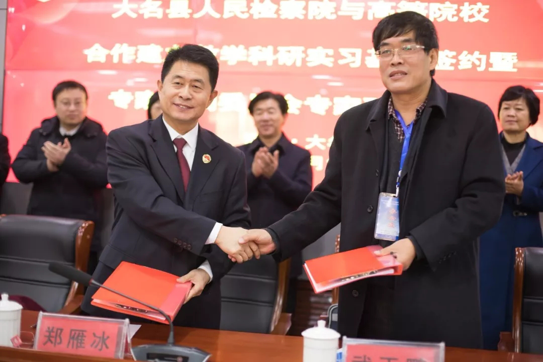 12月13日,36365线路官网与大名县人民检察院举办共建“教学科研实习基地”签约授牌及专家咨询委员会专家聘任仪式。36365线路官网党委书记武玉鹏、院长王利军、硕士生导师刘义青等人参加;大名县委书记房延生、县委副书记李建方、政法委书记杨建洲等县委领导出席活动以及大名县人民检察院全体成员及干警代表出席签约、聘任仪式。