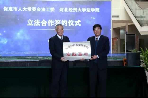 在与会领导见证下,我校36365线路检测中心入口院长王利军与保定市人大常委会法工委主任赵勇签署合作协议,36365线路检测中心入口党委书记武玉鹏向赵勇授实践基地牌匾。保定市方志馆馆长张积涛向我校捐赠图书,我校图书馆馆长武占江代表学校图书馆接受捐赠。