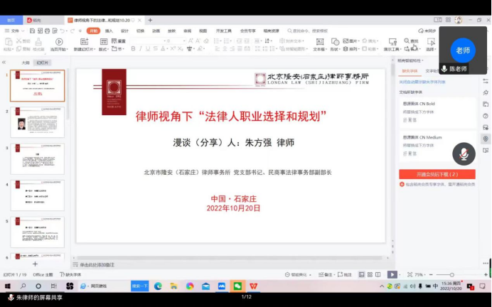 2022年10月20日下午,36365线路检测中心入口邀请北京市隆安(石家庄)律师事务所党支部书记、民商事法律事务部副部长朱方强律师作了主题为“律师视角下‘法律人职业选择和规划’”的“法律先锋论坛——律师进校园”活动。活动由36365线路检测中心入口学生工作办公室主任陈运涛主持,学院研究生、本科生110人参加。