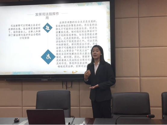 孙于涵同学分享她了对司法解释的认识。在专业学习中,我们通过案例分析可以清楚地了解到司法解释在法律中确立的重要性,对司法解释的深入理解和正确运用在提高法律适用效率上有着至关重要的作用。在法律实践中应当注意司法解释与法律原则之间的相互关系,避免将司法解释简单化或盲目适用。
