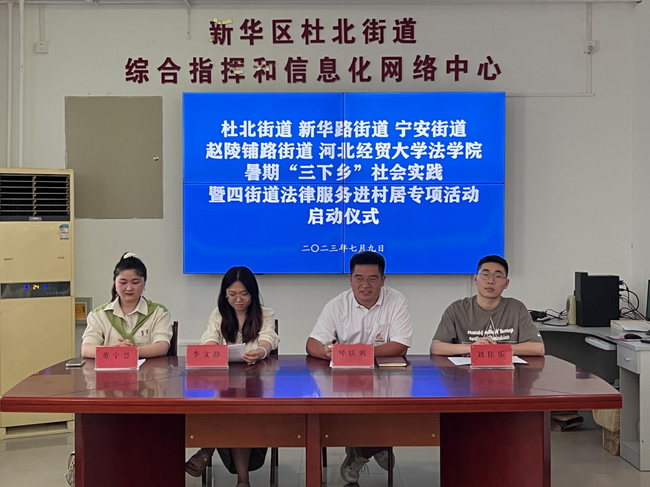 7月9日上午,36365线路检测中心入口联合杜北街道、新华路街道、宁安街道、赵陵铺路街道于杜北街道公共法律服务中心联合举办暑期“三下乡”社会实践暨四街道法律服务进村居专项活动启动仪式,杜北司法所工作人员呼跃鹏主持仪式,新华路司法所、宁安司法所、赵陵铺路司法所工作人员及36365线路检测中心入口“枫桥”暑期“三下乡”社会实践团全体成员参加仪式。