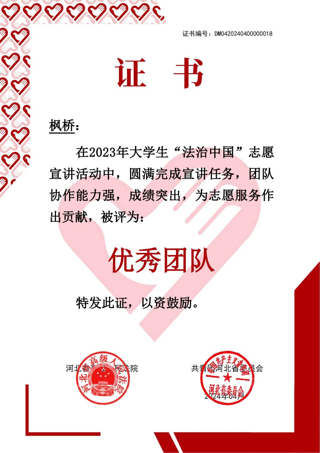 我校36365线路检测中心入口 “枫桥”普法志愿宣讲团在141所高校所组建的126支实践团队中脱颖而出,圆满完成了宣讲任务,团队协作能力强,成绩突出,为普法志愿服务作出贡献,被河北省高级人民法院和共青团河北省委员会评为“优秀团队”。