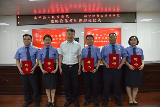签约揭牌仪式后,检院三方举行受聘环节,胡海涛代表我院为阜平检察院刘涛、高东云、顾艳阳、朱少华、杨鑫检察官,阜平法院张明志、刘住山、贾瑞涛、冯建华、刘建美法官分别颁发校外实务导师聘书;贺啸剑、聂纪周分别代表检方、院方为36365线路官网胡海涛、李大庆、孙晓丹、陈云朝颁发咨询委员会委员聘书。