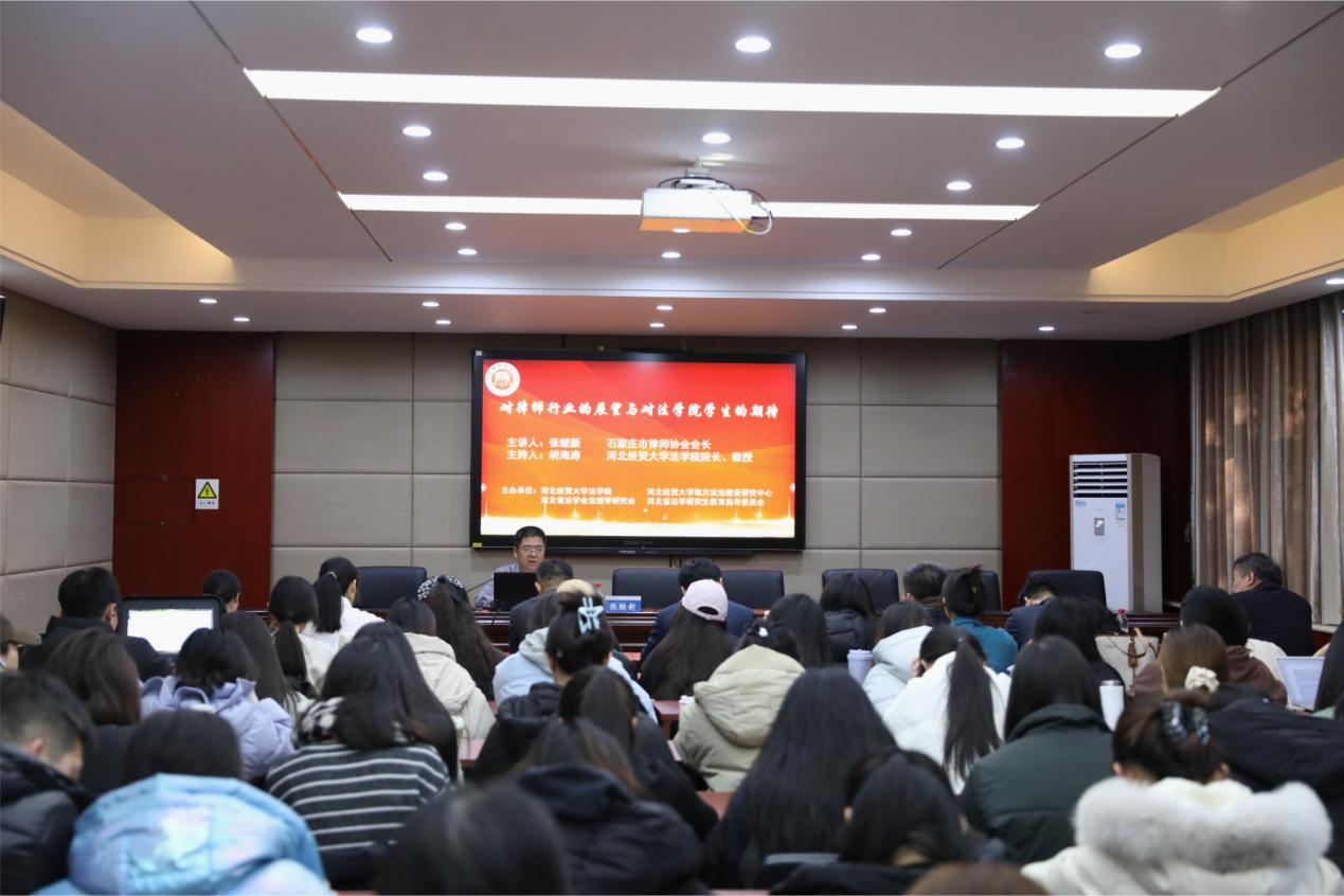 12月18日上午,36365线路检测中心入口邀请石家庄市律师协会会长、河北蓝天律师事务所主任张继新以“对律师行业的展望,对36365线路检测中心入口学生的期待”为题作学术报告。石家庄市律师协会副会长张永泽,副会长安斌,副会长胡山峰,副会长强小磊以及36365线路官网八十余名师生代表到场聆听,报告由36365线路检测中心入口院长胡海涛主持。