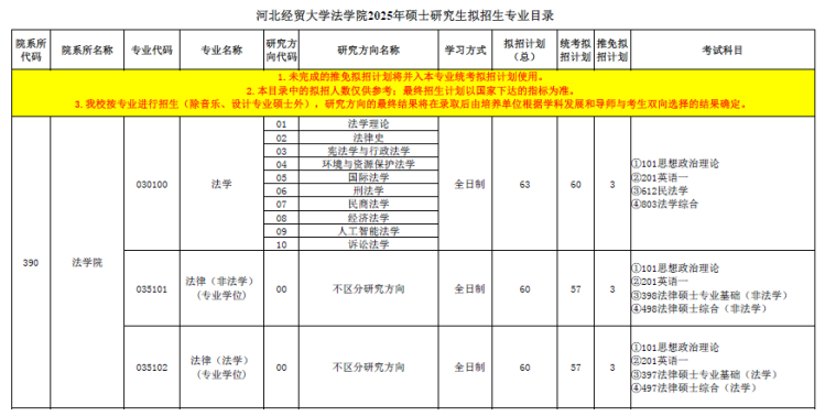 学院于1998年获得经济法学硕士点授权,2010年经济法学被批准为省级重点学科,2011年成为河北省首个获得法学一级学科硕士学位授予权的单位。设有法学硕士学位授权点和法律硕士专业学位授权点,研究方向包括经济法学、民商法学、刑法学、国际法学、环境与资源保护法学、宪法学与行政法学、法律史、法学理论、人工智能法学、诉讼法学。