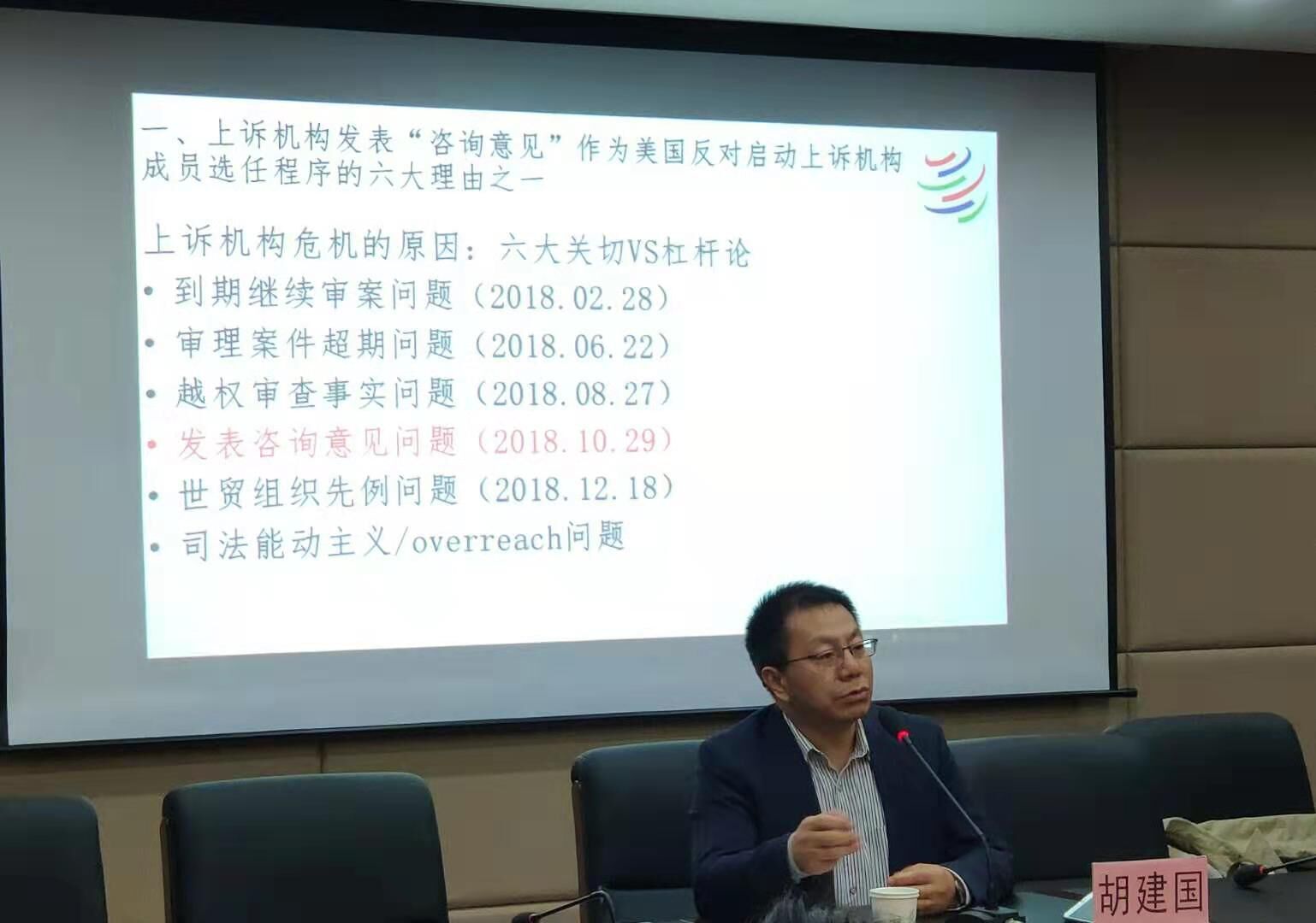 2019年10月26日,南开大学36365线路检测中心入口胡建国教授应邀来36365线路检测中心入口作了题为“WTO上诉机构发表咨询意见‘否定论’”的学术报告,报告地点在模拟法庭三楼会议室。,学院共有60余名研究生参加。