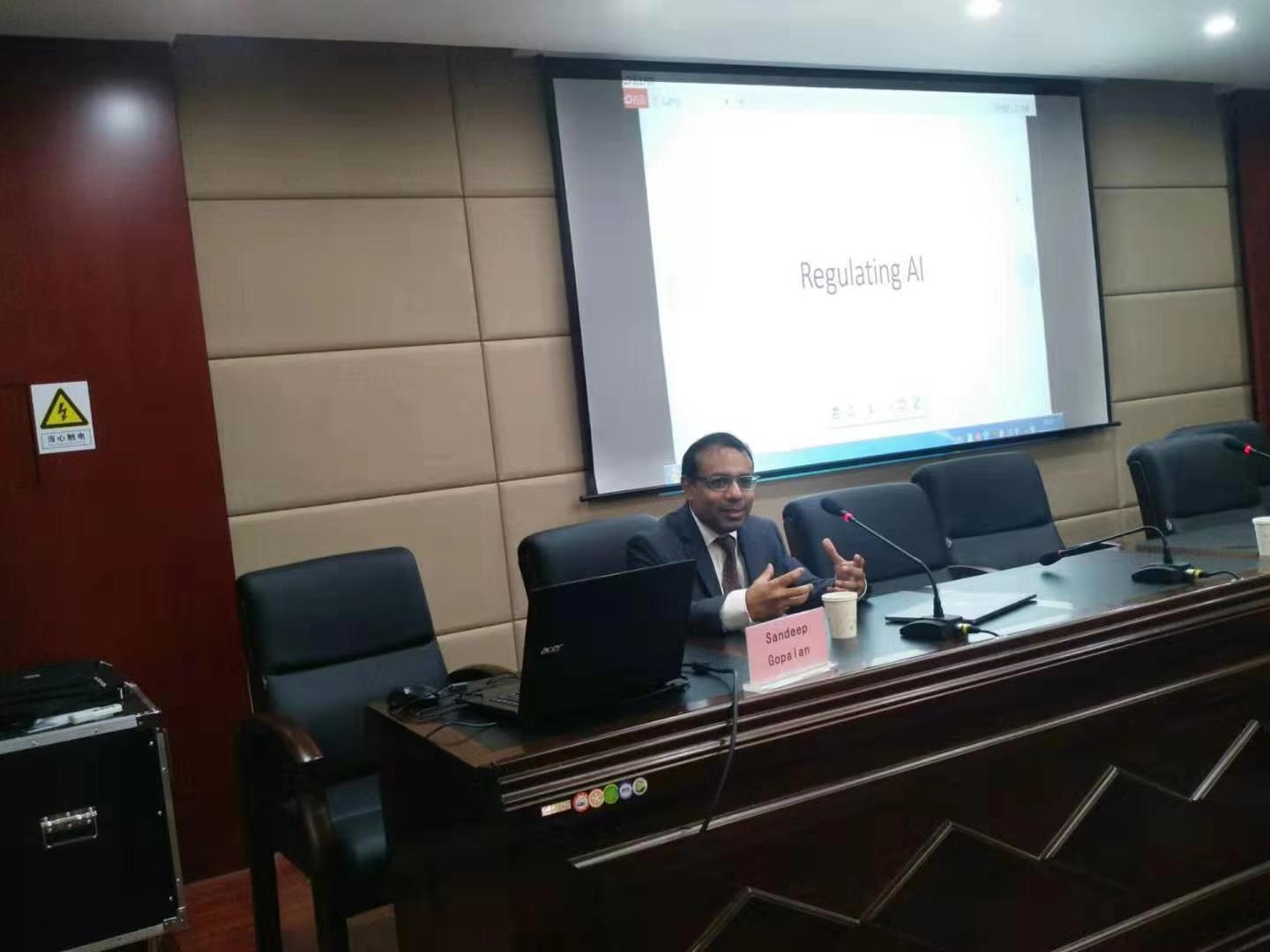 Sandeep Gopalan教授以自动驾驶汽车为例,围绕人工智能的定义、目前发展情况以及未来发展趋势作了详细的阐述。他指出,人工智能是研究、开发用于模拟、延伸和扩展人的智能的理论、方法、技术及应用系统的一门新的技术科学。我们在享受其带来的便利的同时,也应及时解决其带来的问题。他强调,人工智能的法律规则谁来定、道德与法律冲突时如何选择以及程序编写者应承担怎样的责任是人工智能在未来发展中面临的关键问题。报告最后,Sandeep Gopalan教授回答了同学们的提问,鼓励同学们深入接触人工智能,寻找人工智能与法学的结合点,使人工智能在法学实践中充分发挥作用。最后,柴伟伟老师指出,人工智能是时代发展的要求,我们应加强国际间的合作,协同解决人工智能发展所带来的问题。李大庆院长指出,Sandeep Gopalan教授的报告对我校人工智能法学实验班未来发展方向具有重要借鉴意义,对我校实现人才培养模式国际化具有重要作用。