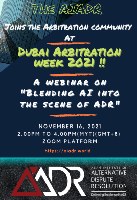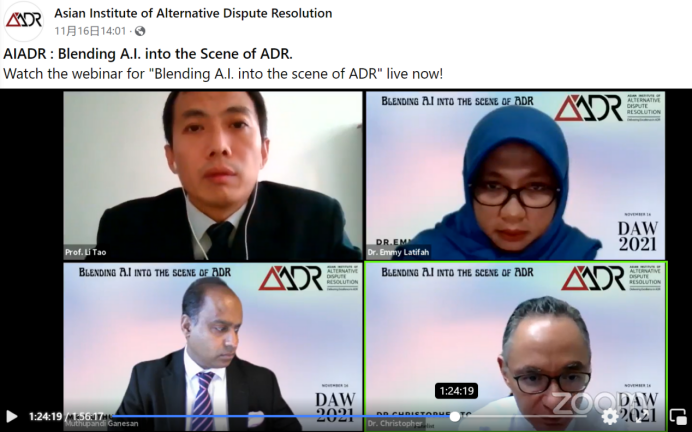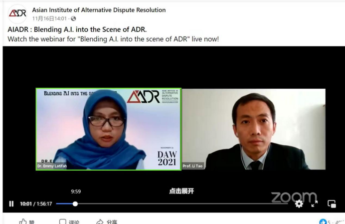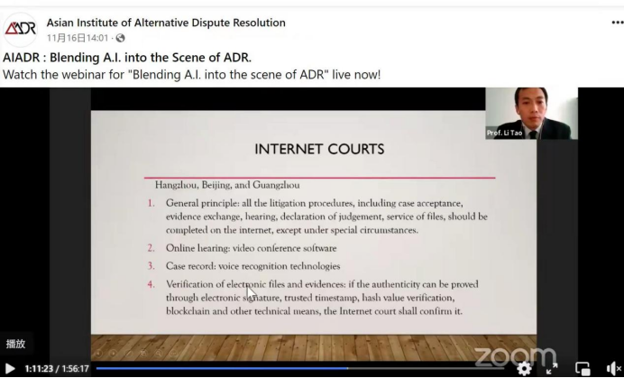 11月16日下午两点,36365线路检测中心入口李涛教授受国际组织——亚洲多元争议解决研究院(AIADR)的邀请参加由迪拜仲裁社区,迪拜国际金融中心仲裁协会(DIFC-LCIA)组织的2021迪拜仲裁周的主题研讨会。研讨会通过zoom会议的形式进行,主题为“将人工智能融入到多元争议解决的场景”。