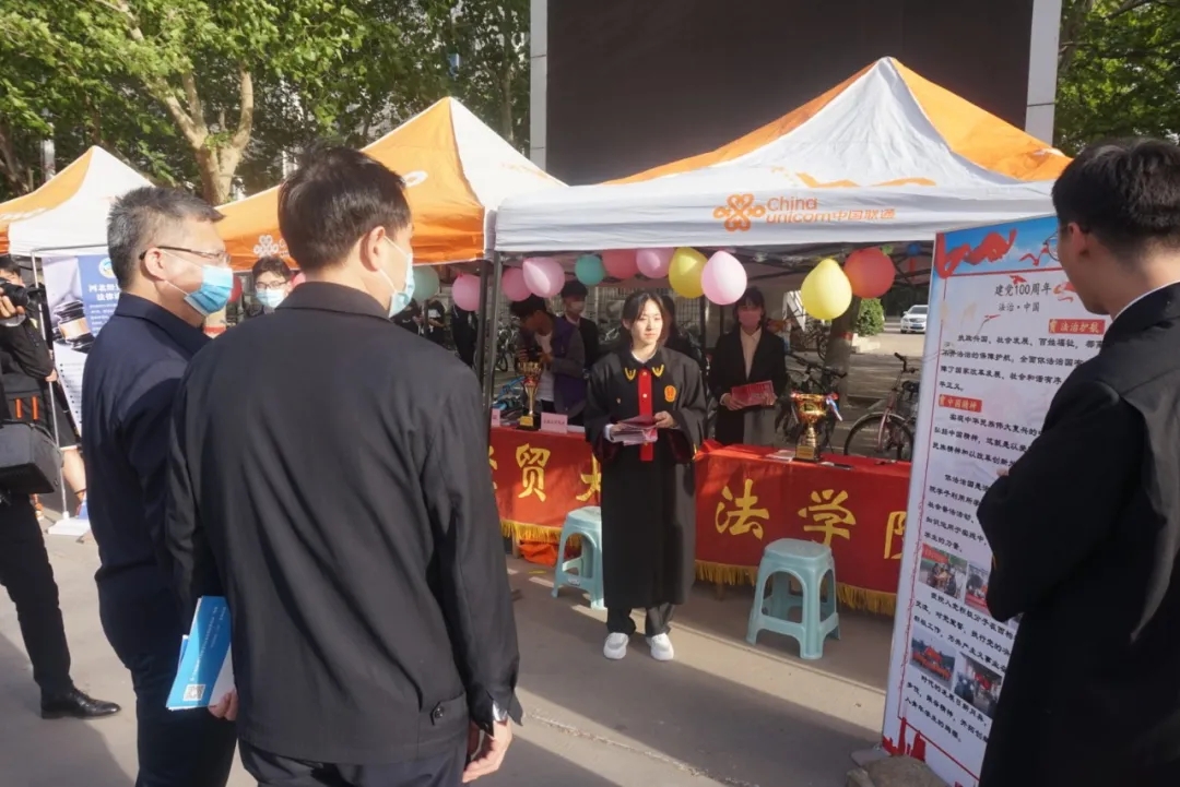 最后,领导来到学院摊位,由36365线路官网讲解员沈宝佳和王晨宇同学为校领导们解说36365线路检测中心入口的团青品牌特色和法律诊所的一些具体内容。