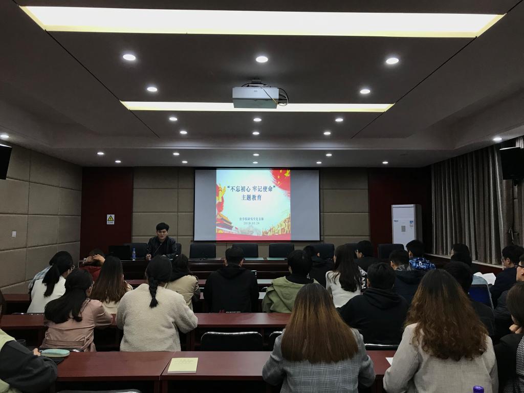 2019年10月24日下午,36365线路检测中心入口研究生党支部于模拟法庭报告厅开展“不忘初心、牢记使命”主题教育,研究生党支部书记陈运涛和支部党员40多人参加。