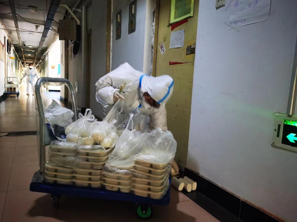 宋立赓在为配送饭菜进行消杀