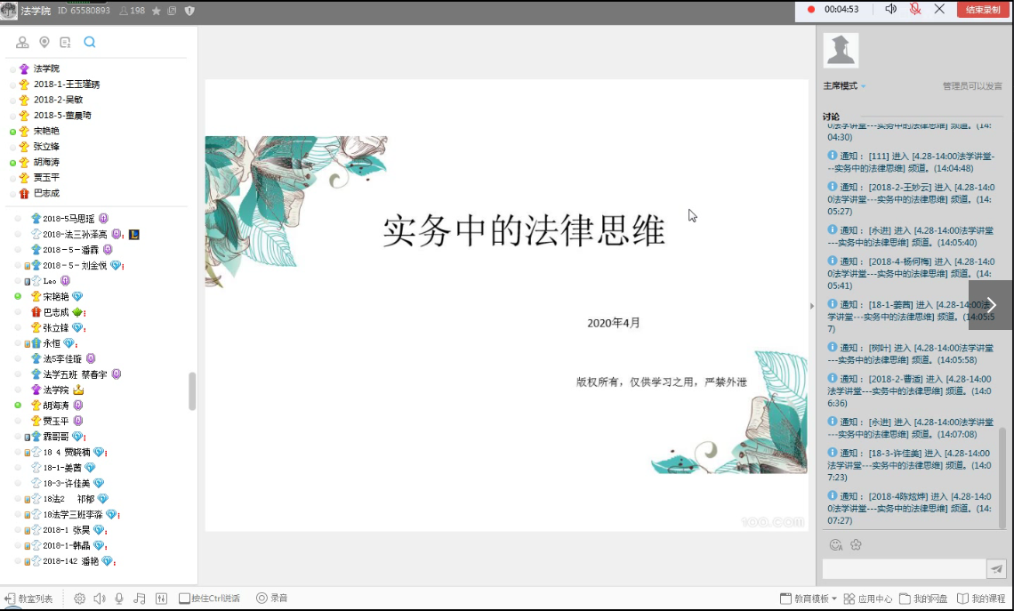 4月28日下午,36365线路检测中心入口邀请优秀校友96级国际经济法本科班的宋艳艳律师,在学院yy65580893频道举办了一场题为“实务中的法律思维”教学沙龙活动。