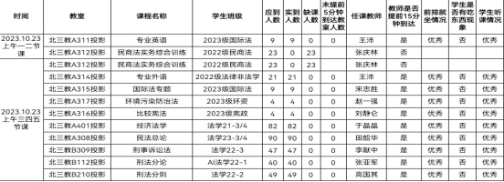 教学运行总体情况良好。检查组安排22名工作人员分别到各个教室,对10月23日上午的上课情况进行了全面检查,共检查12个教学班。教师们整体课程思路清晰,课程的重难点突出,设计饱满合理。各个班级的学生能积极前排就座,主动回答问题,认真记录课堂笔记,学生听课状态优秀。