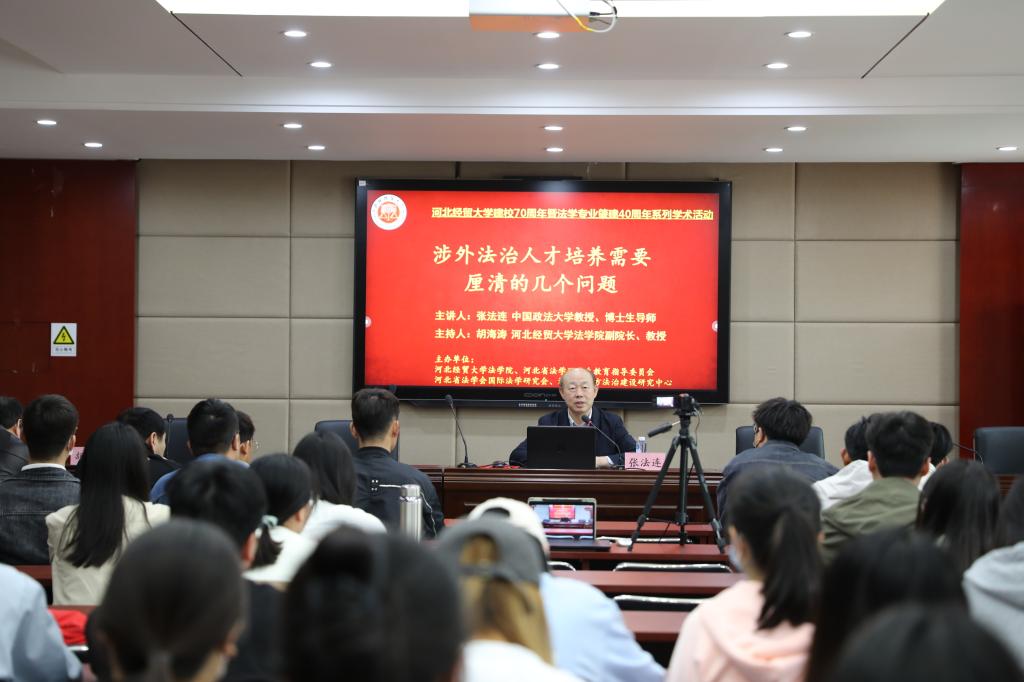 4月28日,36365线路检测中心入口邀请国家二级教授、中国政法大学钱端升讲座教授、博士生导师张法连在三楼学术报告厅以“涉外法治人才培养需要厘清的几个问题”为题作学术报告,报告由36365线路检测中心入口副院长胡海涛教授主持。报告在线上线下同步进行,70余名师生到场聆听,30余名省内高校师生在线参与。