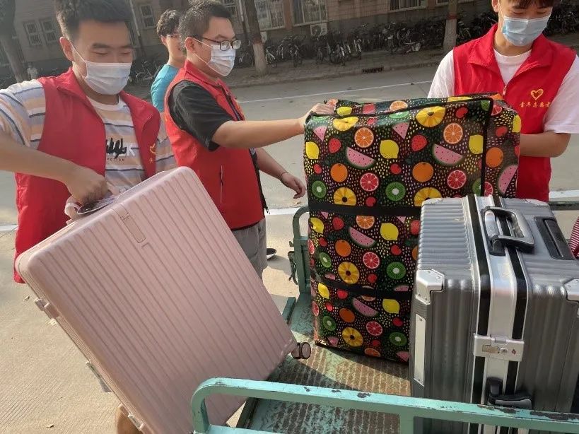 早晨六点多,志愿者们便集结在西门口,准备着迎接新到来的同学。在新生入校后,志愿者便开始了工作。他们贴心地保存好新生们的行李,帮助他们将行李送到摆渡车上。在新生宿舍楼下,每到达一辆摆渡车,志愿者们便会帮助小萌新们搬运行李。这是一项极其枯燥而又辛苦的任务,而志愿者们满是汗水的脸颊上却仍然洋溢着笑容。
