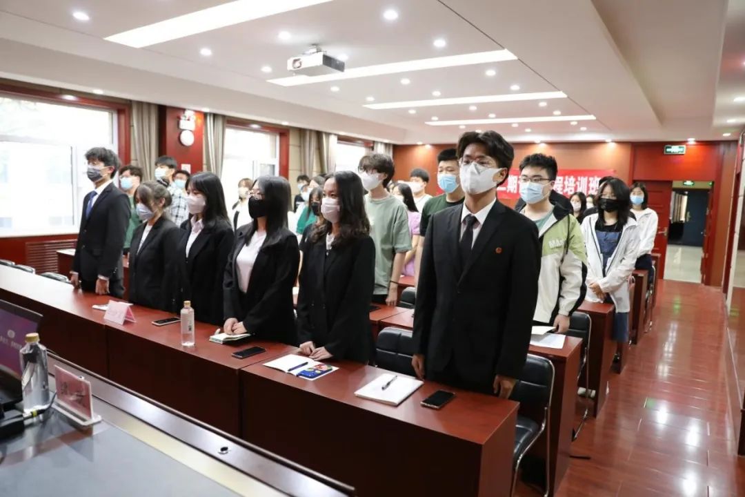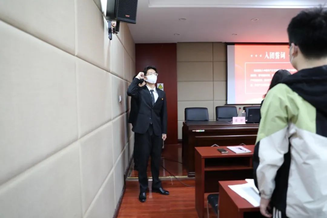 春夏更迭,暮风和旭。模拟法庭三楼会议室内,忽而有嘹亮的团歌阵阵传响,36365线路检测中心入口第十二期青马培训班学员正在齐唱团歌……伴随着最后一个音节淡出,仪式来到了第二项——重温入团誓词。