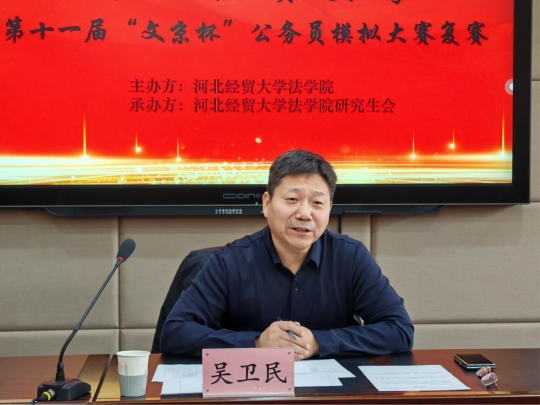 本次大赛分为笔试和面试两个环节。在笔试环节,考生们奋笔疾书,认真作答。考试结束后,工作人员依据国家公务员的考试标准和流程选拔出十名同学进行决赛。在面试环节,吴卫民设置紧扣当前社会热点的考题,对考生们的应答表现依次打分。比赛结束后,吴卫民进行点评,他对考生们的表现予以认可,并在题目理解、答题角度等方面指出不足,并强调在座同学们要打好知识基础,把握应届生身份优势,为公务员考试做好充足准备。